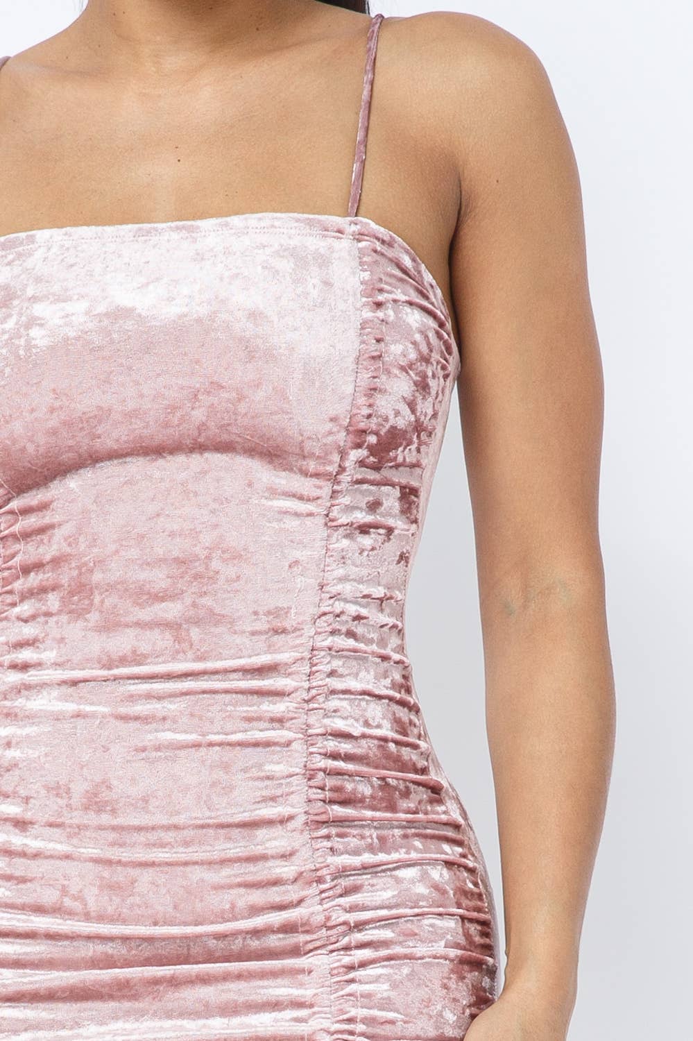 Crushed Velvet Sleeveless Front Shirring Tie Mini Dress Model: 5' 7, Bust 35, Waist 27, Hips 37.6